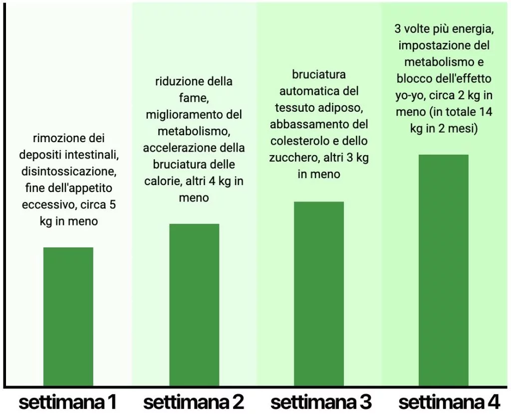 SETTIMANA 1: rimozione dei depositi intestinali + disintossicazione + fine dell’appetito eccessivo = circa 5 kg in meno